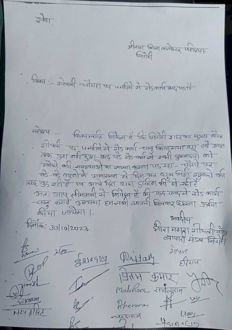 इसी संबंध में झोरा मगरा गोयली चौराहा व्यापारी मंडल के व्यापारियों ने जिला कलेक्टर को एक ज्ञापन दिया है तथा मांग की है कि गोयली चौराहा पर 4 महीने से रोड का कार्य बंद पड़ा है जिससे सभी दुकानदारों को अनेकों समस्याओं का सामना करना पड़ रहा है।