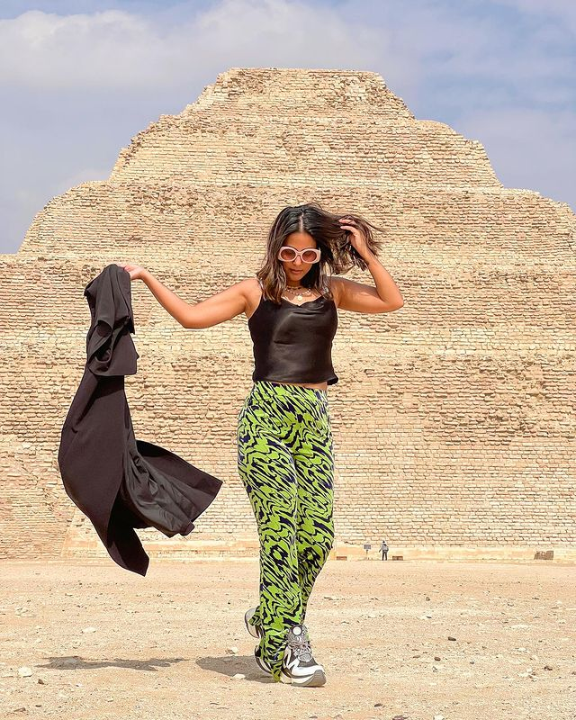 इन तस्वीरों को शेयर करते हुए हिना खान ने इन्हें कैप्शन दिया - 'मिस्र के सकारा में बने अब तक के पहले पिरामिड के सामने एक-एक कदम..'।