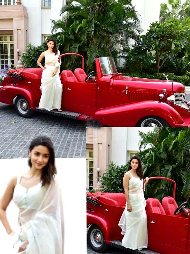 इन फोटोज़ में आलिया भट्ट एक रेड कलर की विंटेज कार के साथ गंगूबाई के स्टाइल में पीछे मुड़कर नमस्ते करती नजर आ रहीं हैं।