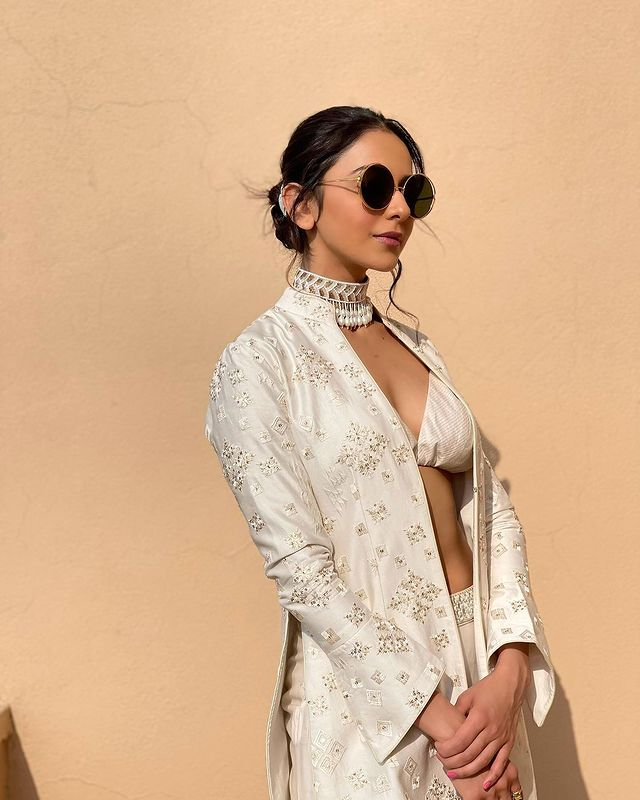 रकुल प्रीत ने व्हाइट चोकर और गोल विंटेज शेड्स के साथ अपने लुक को और आकर्षक बनाया।