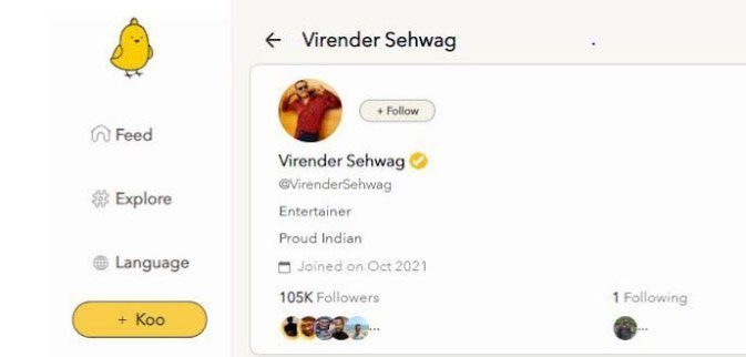 India @ सोशल मीडिया प्लेटफॉर्म 'KOO': इंडियन क्रिकेट टीम के दिग्गज वीरेंद्र सहवाग ने मेड-इन इंडिया सोशल मीडिया प्लेटफॉर्म कू पर की एंट्री, 15 दिनों में 1 लाख फॉलोअर्स